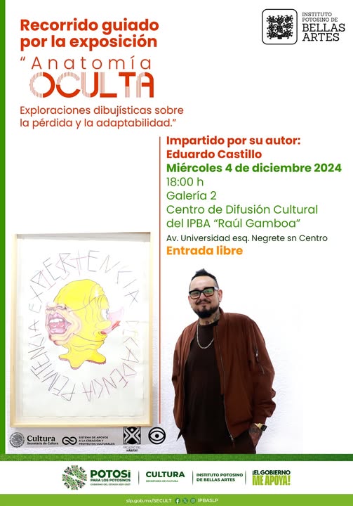 Acércate a la obra de Eduardo Castillo y descubre su exposición «Anatomía oculta, exploraciones dibujísticas sobre la pérdida y la adaptabilidad» con este recorrido guiado! ???? Miércoles 4 de diciembre 2024 | 18:00 h | Gal. 2 del Centro de Difusión Cultural del IPBA «Raúl Gamboa».