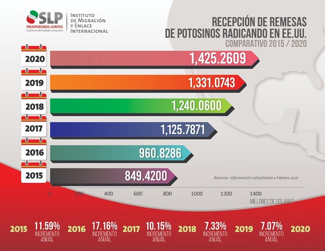 El total recibido en 2020 en San Luis Potosí son 1 mil 425 millones de dólares y los municipios con mayor captación de remesas fueron la capital del estado, seguido de Rioverde, Matehuala, Salinas, Soledad de Graciano Sánchez, Ciudad Valles, Cerritos, Tamazunchale, Santa María del Río y Villa de Ramos.