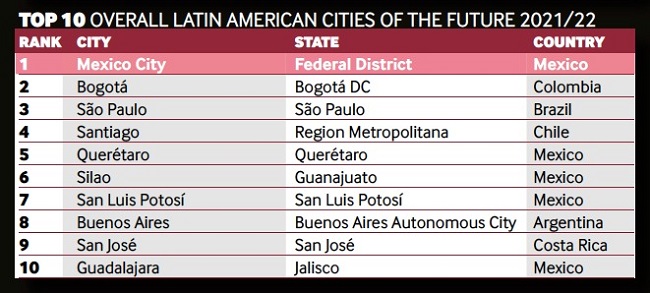 El reporte del Financial Times, ubicó a la ciudad de San Luis Potosí en el lugar número 7 de las 10 ciudades Latinoamericanas del Futuro, bajo criterios que midieron el potencial económico, el contexto amigable a los negocios, el capital humano y estilo de vida, el costo-efectividad y la conectividad, por encima de ciudades como Buenos Aires, Argentina, San José en Costa Rica y Guadalajara, Jalisco, en México. Cabe destacar que en la primera posición se ubica la Ciudad de México, seguida de Bogotá, Sao Paulo, Santiago, Querétaro y Silao.