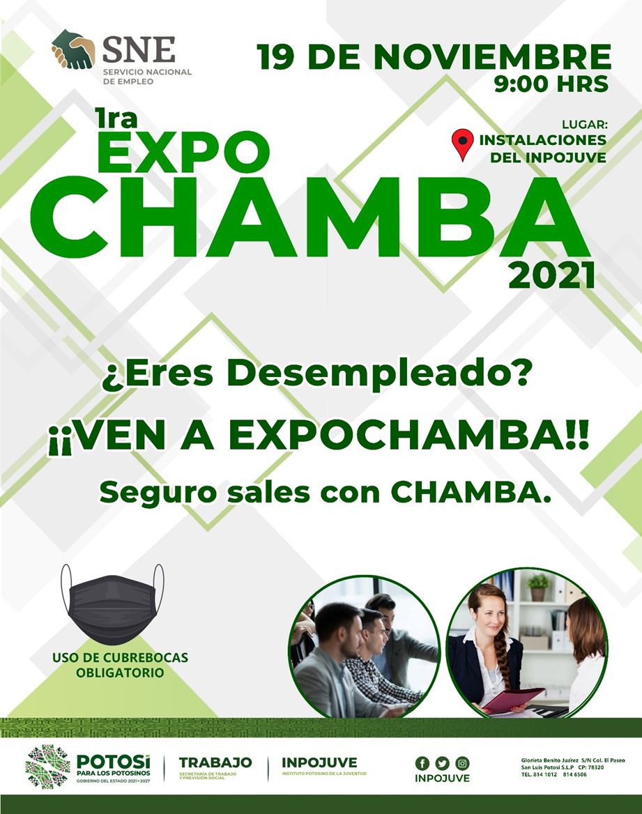 La “Expo Chamba” se efectuará en las instalaciones del Instituto Potosino de la Juventud de las 9:00 a las 14:00 horas, en la dirección: Glorieta Juárez s/n., col. El Paseo, en la capital. Se informa que se contarán con las todas las medidas de higiene y sanidad, y se exhorta hacer uso de cubrebocas obligatorio, sana distancia y aplicación de gel antibacterial, durante el desarrollo del evento.