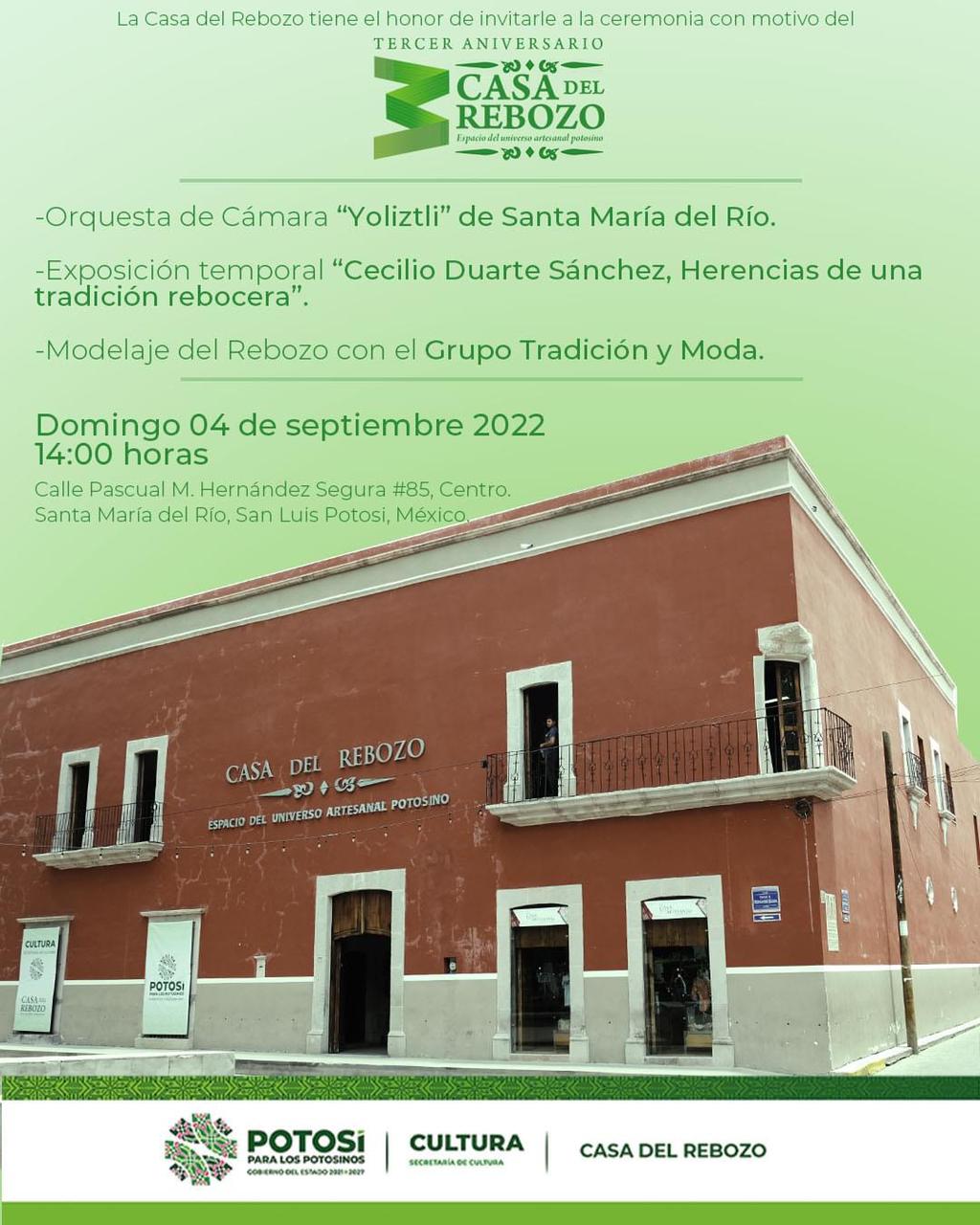 La programación para celebrar, el tercer año de la Casa del Rebozo está integrada por contenidos digitales como cápsulas informativas, homenajes a quienes con la práctica de su oficio como artesanas y artesanos han preservado el patrimonio artesanal de San Luis Potosí, así como un concierto de música popular mexicana.