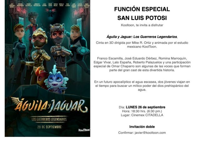 San Luis Potosí, S.L.P; El próximo jueves 29 de septiembre las salas de cine a nivel nacional se llenarán de magia con el estreno de Águila y Jaguar: Los guerreros legendarios, película dirigida por Mike R. Ortiz. Una cinta animada que busca promover el cuidado del agua y retomar algunos de los mitos más importantes de la mitología maya y azteca.