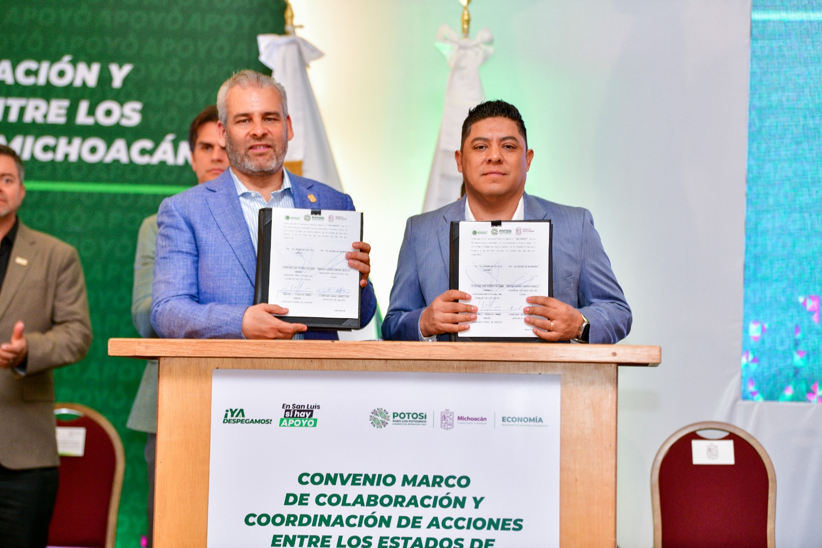 Con el apoyo de líderes empresariales, los Gobernadores de San Luis Potosí Ricardo Gallardo Cardona y de Michoacán, Alfredo Ramírez Bedolla, firmaron un Convenio Marco de Colaboración y Coordinación de Acciones, para mejorar la agroindustria, impulsar a las pequeñas y medianas empresas, así como proyectos de turismo.
