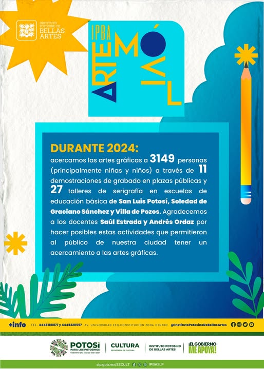El Programa Arte Móvil del IPBA durante 2024 acercó las artes gráficas a 3149 personas (principalmente niñas y niños) a través de 11 demostraciones de grabado en plazas públicas y 27 talleres de serigrafía en escuelas de educación básica de San Luis Potosí, Soledad de Graciano Sánchez y Villa de Pozos.