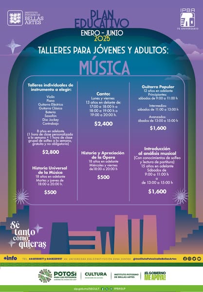 Ofrecemos clases de canto, el nuevo taller de guitarra popular, historia universal de la música, talleres individuales de instrumento y muchas opciones más.