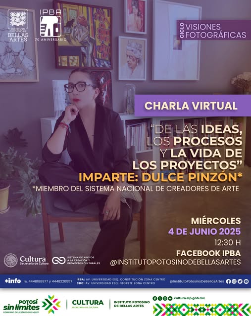 Dulce Pinzón impartirá la charla virtual De las ideas, los procesos y la vida de los proyectos el miércoles 4 de junio a las 12:30 horas a través de la página de Facebook del Instituto Potosino de Bellas Artes. La actividad forma parte del ciclo Visiones Fotográficas, una serie de encuentros digitales que buscan generar diálogo entre creadoras y creadores con trayectoria y nuevos públicos. La conversación girará en torno al desarrollo de proyectos artísticos desde la idea inicial hasta su vinculación con agentes culturales y sociales.