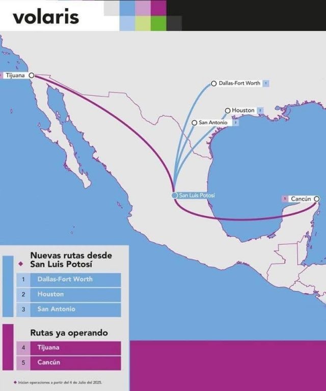 Esta nueva conexión amplía las rutas actuales de Volaris que ya incluyen destinos como Cancún y Tijuana, lo que posiciona a San Luis Potosí como un polo estratégico para la inversión, el comercio y el turismo.