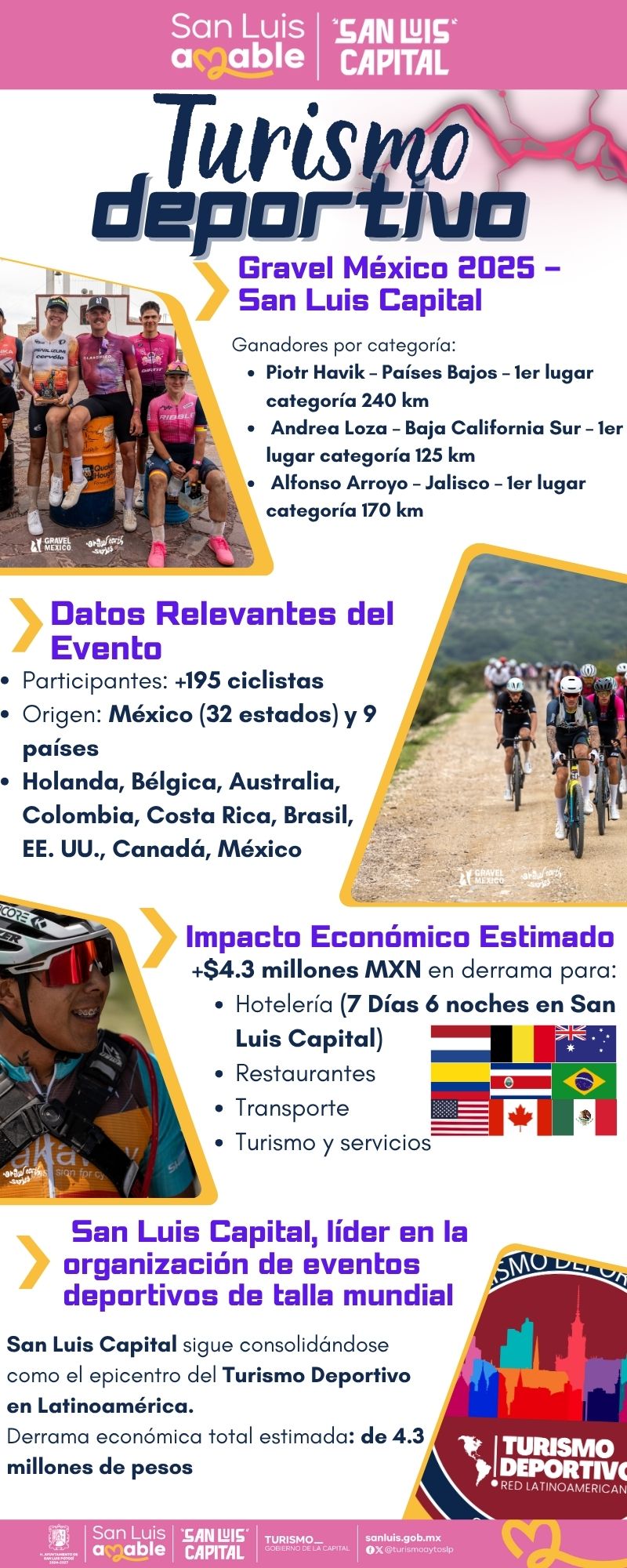 Con una derrama aproximada de 4.3 millones de pesos , que benefician directamente al sector turismo de la capital potosina y municipios involucrados, el pasado fin de semana San Luis Capital hizo historia como la única sede en México del serial internacional Gravel México, un encuentro deportivo de ciclismo de alto rendimiento, que exige gran resistencia física y mental.