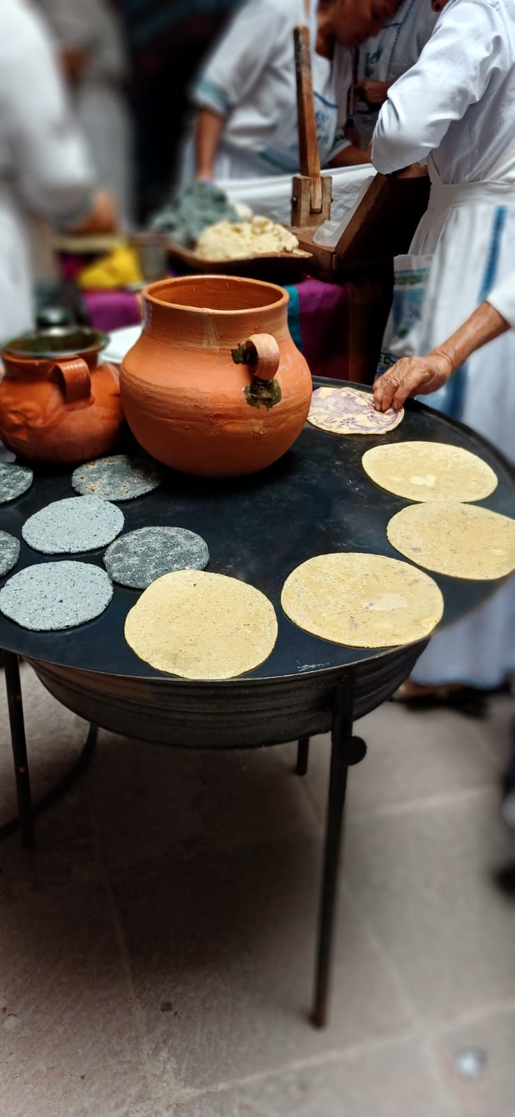 Ahí descubrí el tema que tanto me intrigaba, Gloria Vázquez, quien lidera al grupo de cocineras me explicó que la tintura de las tortillas se obtiene de una planta medicinal llamada “muicle”, que es un arbusto cuyas hojas según maduran van adquiriendo coloraciones entre rosas y morados, también se pinta con otra planta medicinal llamada raíz china, conocida también como palo de Brasil y los tonos verdes se adquieren con nopal.